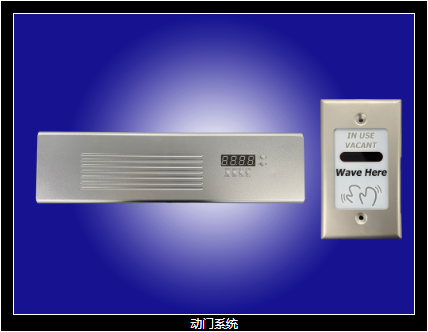 动门系统 该系统将安装在医院或诊所,以便患者/访客可以避免用手部接触,使用洗手间。洗手后,你只要挥手示意,门便会自动打开。 如果该系统用于一个单独的休息室中,则可选择使用运动传感器来检测。